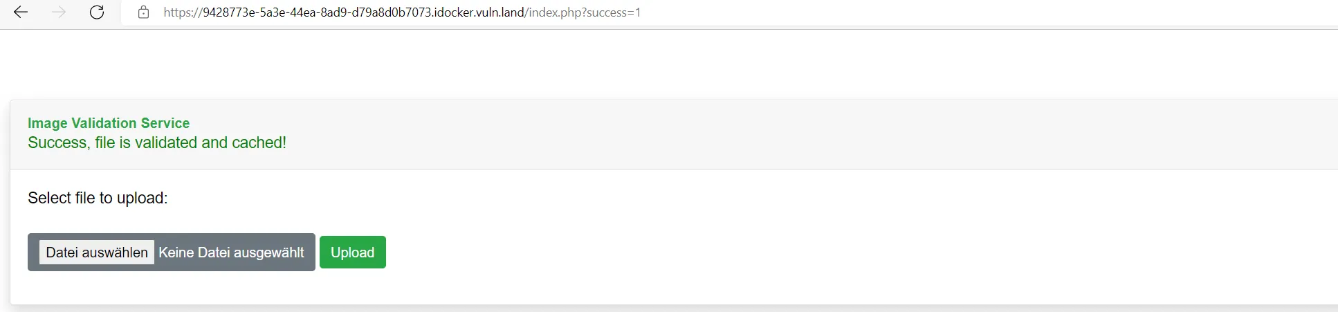 When uploading an image file (I tried png, jpg and jpeg), we get redirected to index.php?success=1 showing a success message indicating Success, file is validated and cached. Especially the word cached is interesting here. Seems like the file is saved somewhere.