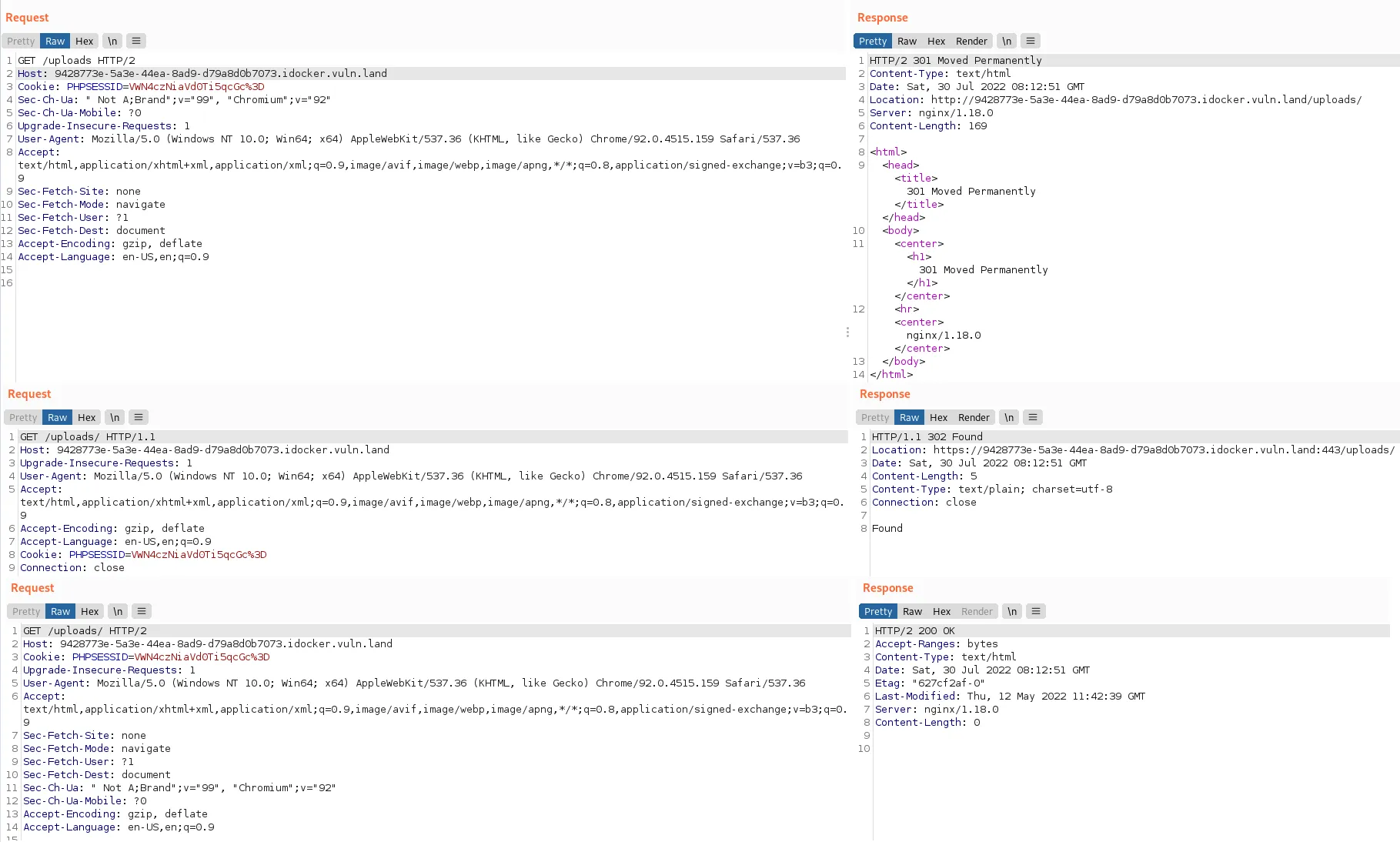 Bruteforcing directories reveals an /uploads directory. This seems interesting. When requesting /uploads, after being redirected a couple of times, we get a 200 OK with an empty html: