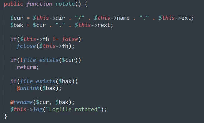 rotatefunction. From the code, it looks like the server is working with two log files. One current log file, and the previous log file. When the function is called, the current log file has a.bakappended and a new current logfile is created. - A